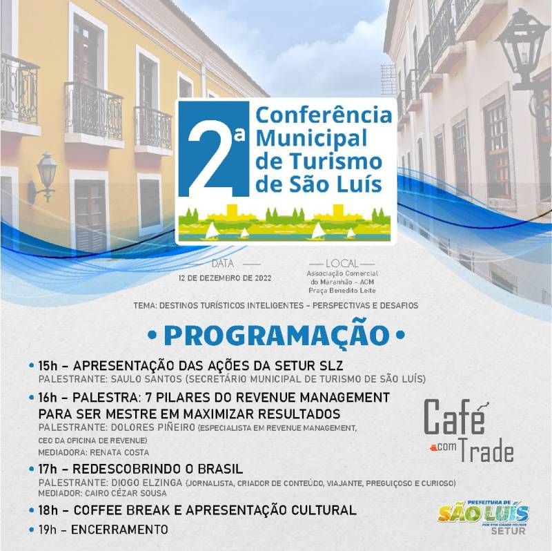 A Prefeitura de São Luís MA, por meio da Secretaria Municipal de Turismo (Setur), realizará a “II Conferência Municipal de Turismo de São Luís”, no dia 12 de dezembro, das 15h às 19h. Na oportunidade, também serão apresentadas as ações da Setur no ano de 2022.